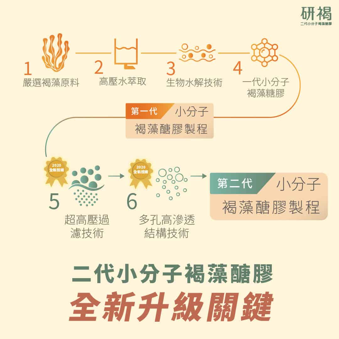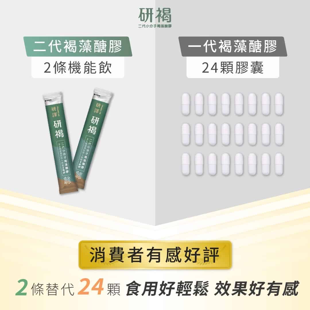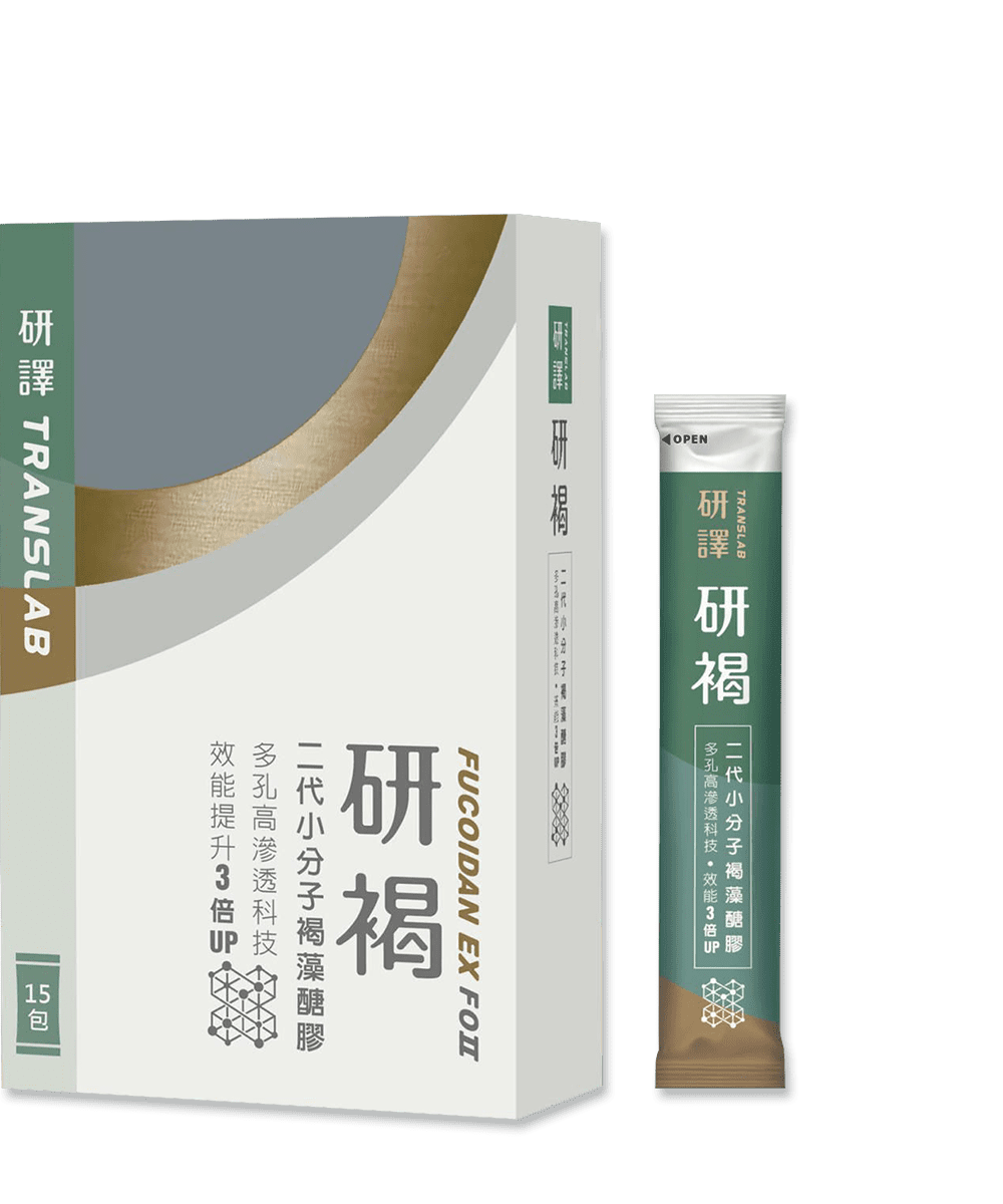 好消息~ 第二代小分子褐藻醣膠 研褐 褐藻機能飲 全新上市 液體好吸收 使用更方便 同樣劑量的有效成分 至少是一代的兩倍! 一包機能飲 等於第一代的 12顆膠囊 面對重大保養 純度多一倍 活性強三倍 第二代褐藻醣膠 提供您更強大的戰鬥力 褐藻醣膠的特色 選擇褐藻醣膠的五大關鍵 Fucoidan褐藻糖膠是一般食品 並非藥品,也不能取代醫師的治療,如非一般體質日常保養使用者請先詢問醫師或營養專家 目前市場主流,以小分子褐藻糖膠為主 因為分子小,吸收快,至於有些品牌宣稱有{專利}都是指~生產的方式專利,而不是~褐藻醣膠的成分有專利 褐藻醣膠的效果,關鍵是有效成分的含量 小分子褐藻醣膠的{含量越多 效果越好}花一樣的錢,當然希望買到的有效含量越高囉~畢竟面對重大保養,決定勝負的關鍵就是~速度、成本 研褐推出的二代小分子褐藻糖膠 就是利用先進的技術,過濾掉製造褐藻糖膠過程中的雜質與沉澱物,達到 99% 的溶解度,有效活性比一代產品提升 300% 褐藻糖膠使用的方式 有:膠囊、粉劑、液體,其中液體機能飲最方便,小包裝(10cc ) 攜帶方便,食用不必再找水沖泡或吞服,沒有沉澱物,遇到管灌也不用擔心會阻塞