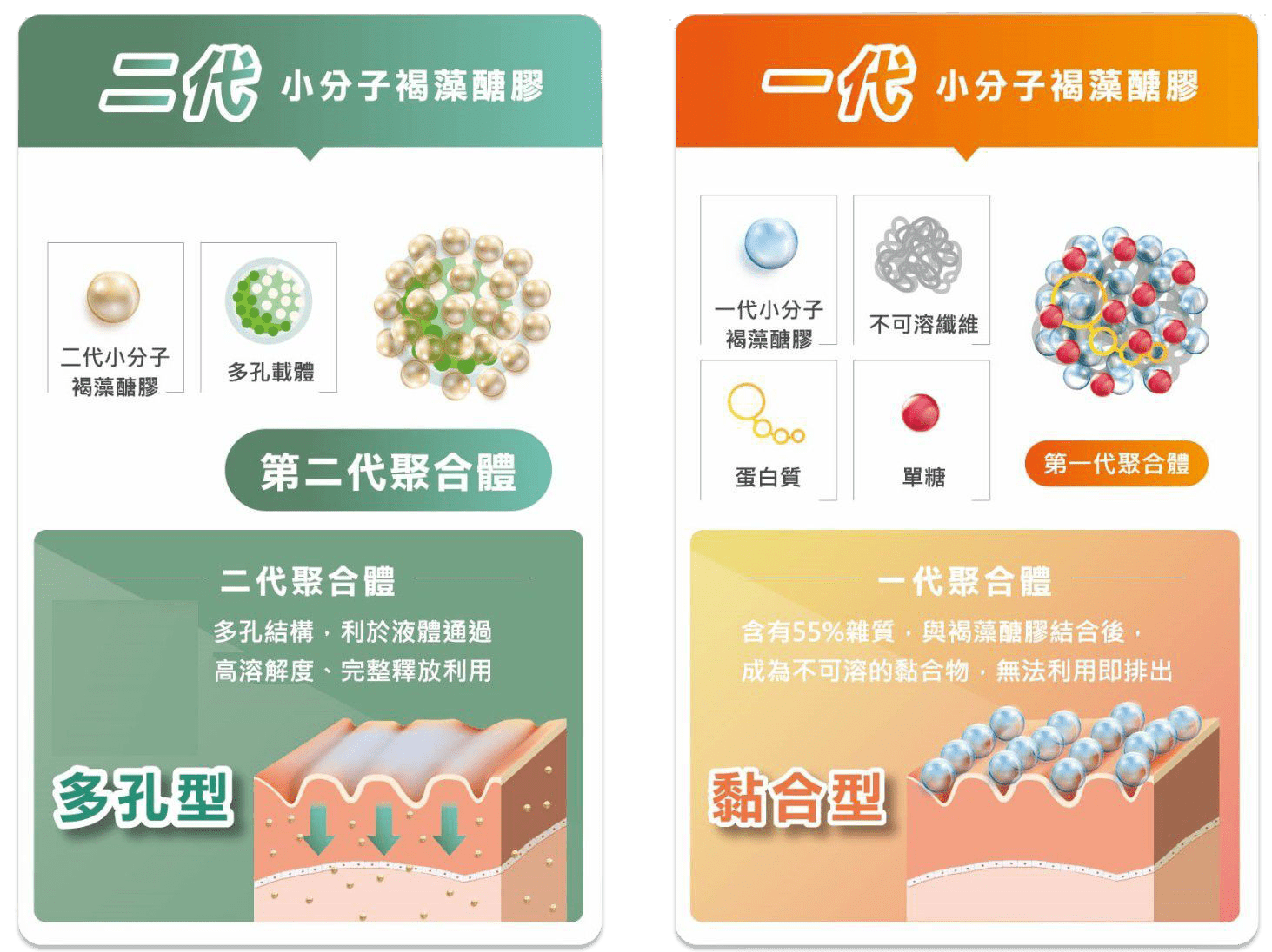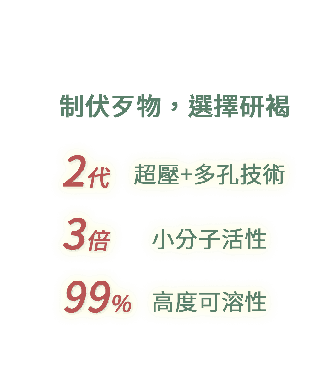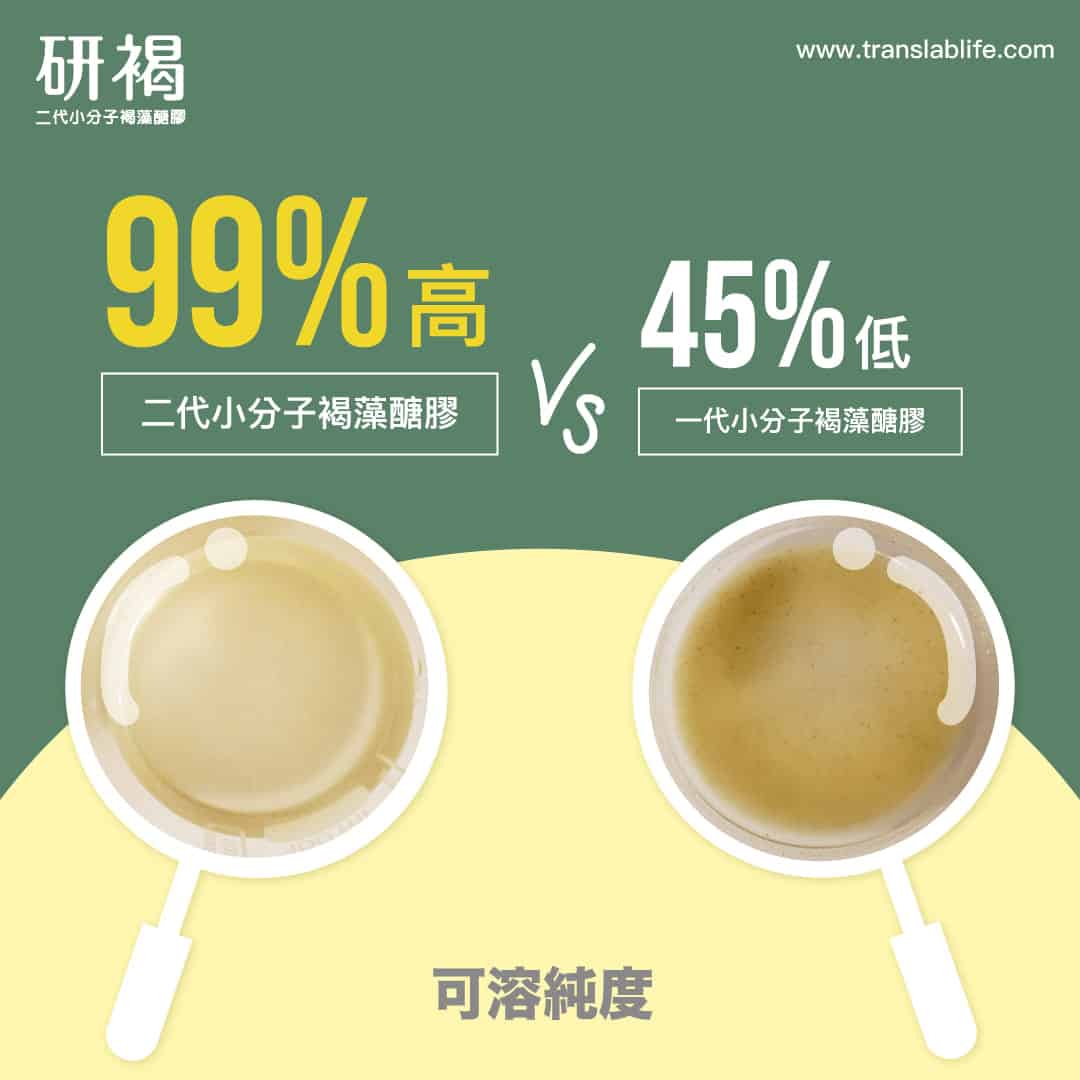 好消息~ 第二代小分子褐藻醣膠 研褐 褐藻機能飲 全新上市 液體好吸收 使用更方便 同樣劑量的有效成分 至少是一代的兩倍! 一包機能飲 等於第一代的 12顆膠囊 面對重大保養 純度多一倍 活性強三倍 第二代褐藻醣膠 提供您更強大的戰鬥力 褐藻醣膠的特色 選擇褐藻醣膠的五大關鍵 Fucoidan褐藻糖膠是一般食品 並非藥品,也不能取代醫師的治療,如非一般體質日常保養使用者請先詢問醫師或營養專家 目前市場主流,以小分子褐藻糖膠為主 因為分子小,吸收快,至於有些品牌宣稱有{專利}都是指~生產的方式專利,而不是~褐藻醣膠的成分有專利 褐藻醣膠的效果,關鍵是有效成分的含量 小分子褐藻醣膠的{含量越多 效果越好}花一樣的錢,當然希望買到的有效含量越高囉~畢竟面對重大保養,決定勝負的關鍵就是~速度、成本 研褐推出的二代小分子褐藻糖膠 就是利用先進的技術,過濾掉製造褐藻糖膠過程中的雜質與沉澱物,達到 99% 的溶解度,有效活性比一代產品提升 300% 褐藻糖膠使用的方式 有:膠囊、粉劑、液體,其中液體機能飲最方便,小包裝(10cc ) 攜帶方便,食用不必再找水沖泡或吞服,沒有沉澱物,遇到管灌也不用擔心會阻塞